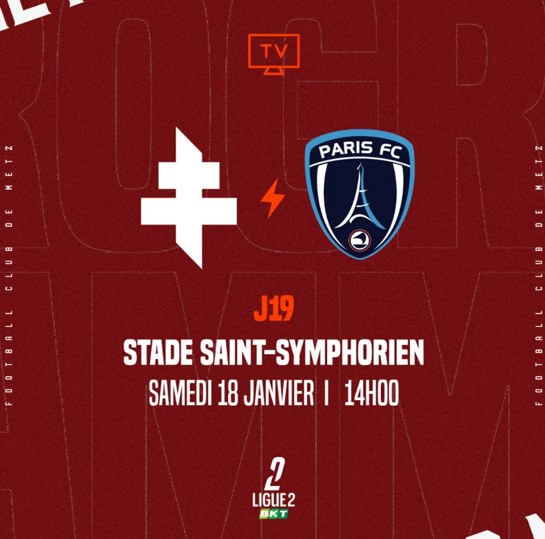 L’affiche de ce début d’année au Stade Saint-Symphorien, le FC METZ reçoit le PARIS FC pour un match de haut de tableau. Cette rencontre comptera pour la 19e journée de Ligue 2 et aura lieu le samedi 18 janvier à 14h.